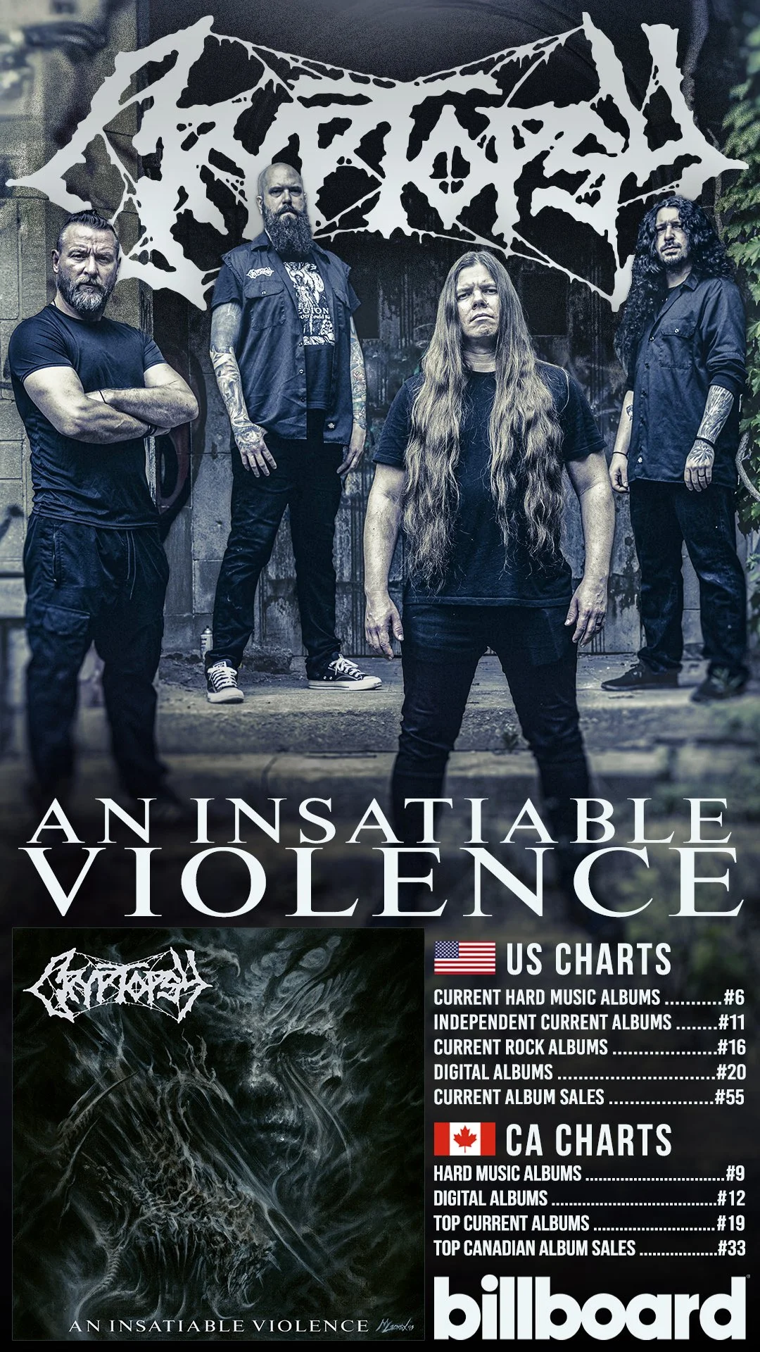 While only a year removed from winning a JUNO Award, Cryptopsy are already outdoing themselves. The most vile band in death metal have graced the cover of Decibel and snatched Metal Injection's Artist of the Month, leading metal maniacs to quickly devour their latest offering. An Insatiable Violence has amassed more than one million streams while vaulting to #9 on the Billboard Current Hard Music Album chart in Canada. So of course, they still have another shocking treat hidden up their longsleeves.