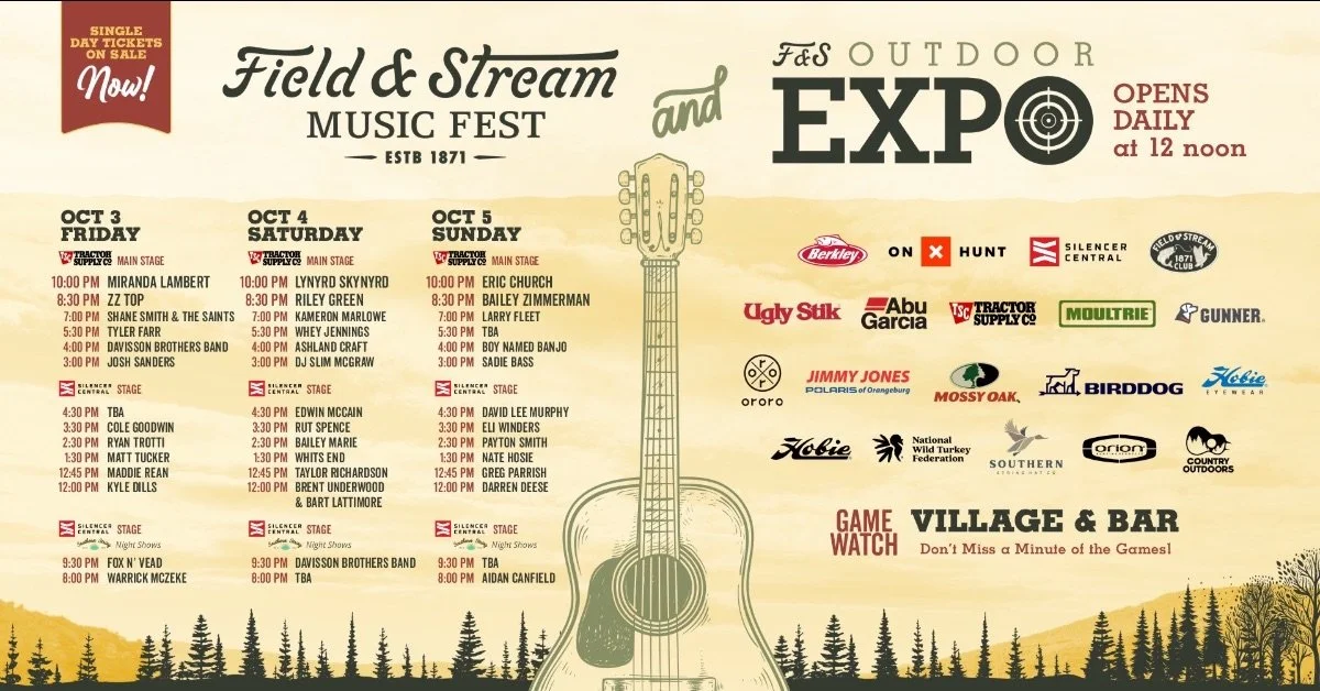 “The Outdoor Expo Experience is what sets Field & Stream Music Fest apart,” said Bob Durkin, co-founder of Southern Entertainment. “It’s more than great music — it’s about stepping into the Field & Stream lifestyle on 3,000 acres of God’s country. From fishing to the fan zone, there’s something for everyone.”