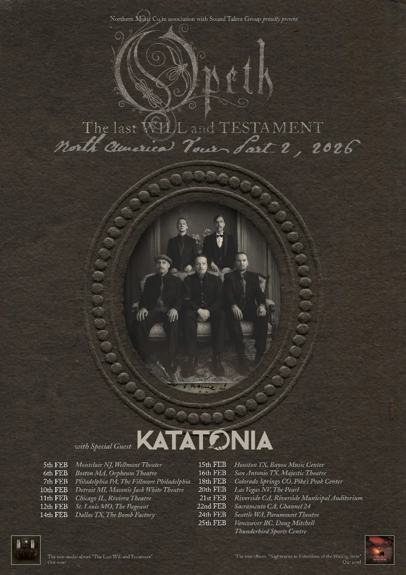 Swedish progressive metal titans OPETH are preparing to return across the Atlantic to bring their fearless 14th studio album to stages across North America. The critically acclaimed The Last Will And Testament (released on November 22, 2024 through Moderbolaget / Reigning Phoenix Music), saw frontman Mikael Åkerfeldt return to growling vocal territory for the first time in 16 years. The Last Will And Testament North American Tour Part 2 will begin in February 2026.
