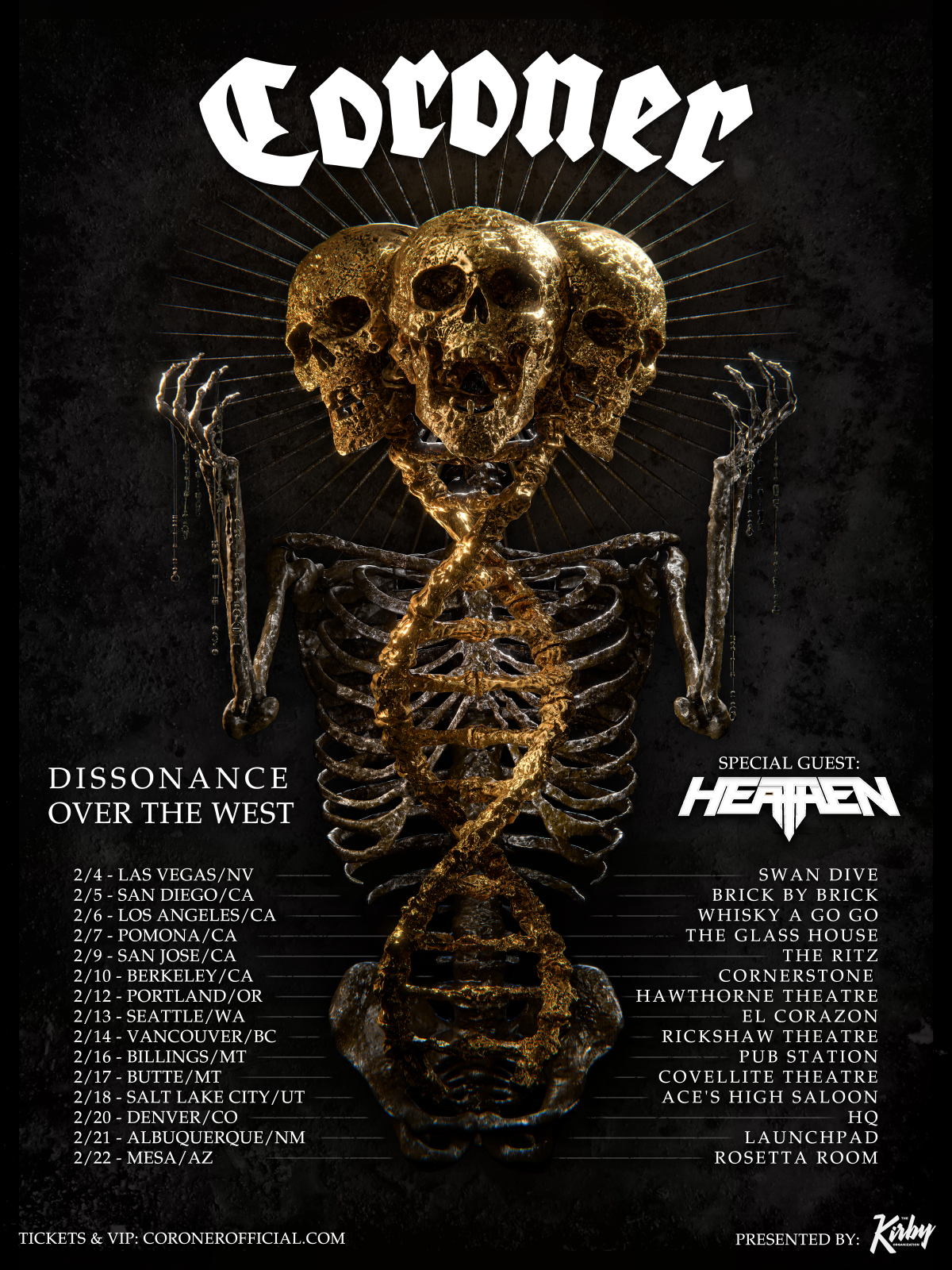 Technical thrash pioneer CORONER will be embarking on a West Coast headlining tour in North America early next year in which they will be supported by HEATHEN! The "Dissonance Over the West" tour will kick off on February 4 in Las Vegas, NV and will make its way through the U.S. and Canada through the last stop on February 22 in Mesa, AZ. The full tinteray can be found below while ticket pre-sales started, November 21 @ 10:00 A.M. PST. Tickets will be made available at THIS LOCATION.