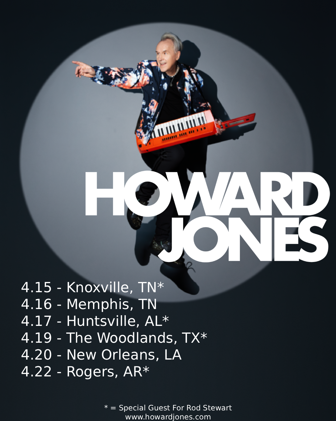 New wave icon Howard Jones will soon head out on the road for select United States tour dates in April. Jones will be main support for Rod Stewart for several shows and will also play headlining shows in between that routing. Please see below for the itinerary. 2025 saw Jones perform over 60 dates throughout the US and Europe, honoring the 40th anniversary of his smash hit album, DREAM INTO ACTION. Look for an upcoming announcement on his summer tour plans for 2026 soon.