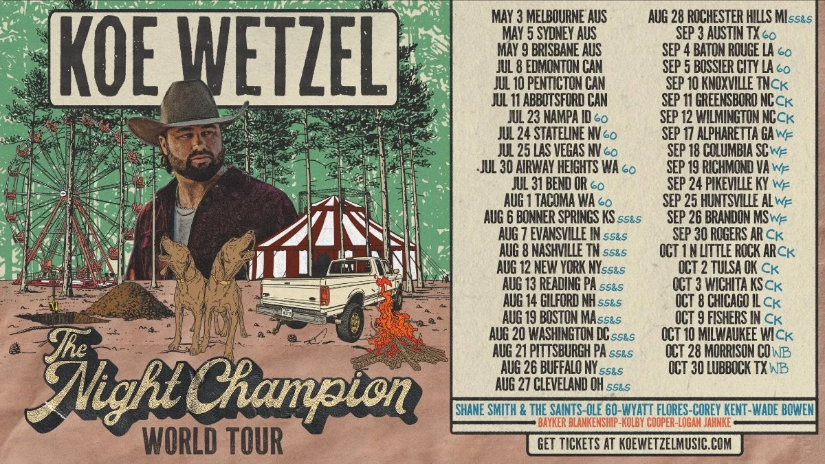 Pollstar’s “firebrand live sensation” Koe Wetzel returns to the road with aptly named The Night Champion World Tour, a 45-city headlining run this summer and fall. Shane Smith & The Saints, Ole 60, Wyatt Flores, Corey Kent, Wade Bowen, Bayker Blankenship, Kolby Cooper and Logan Jahnke join as support across varying dates throughout the U.S., Canada and Australia.