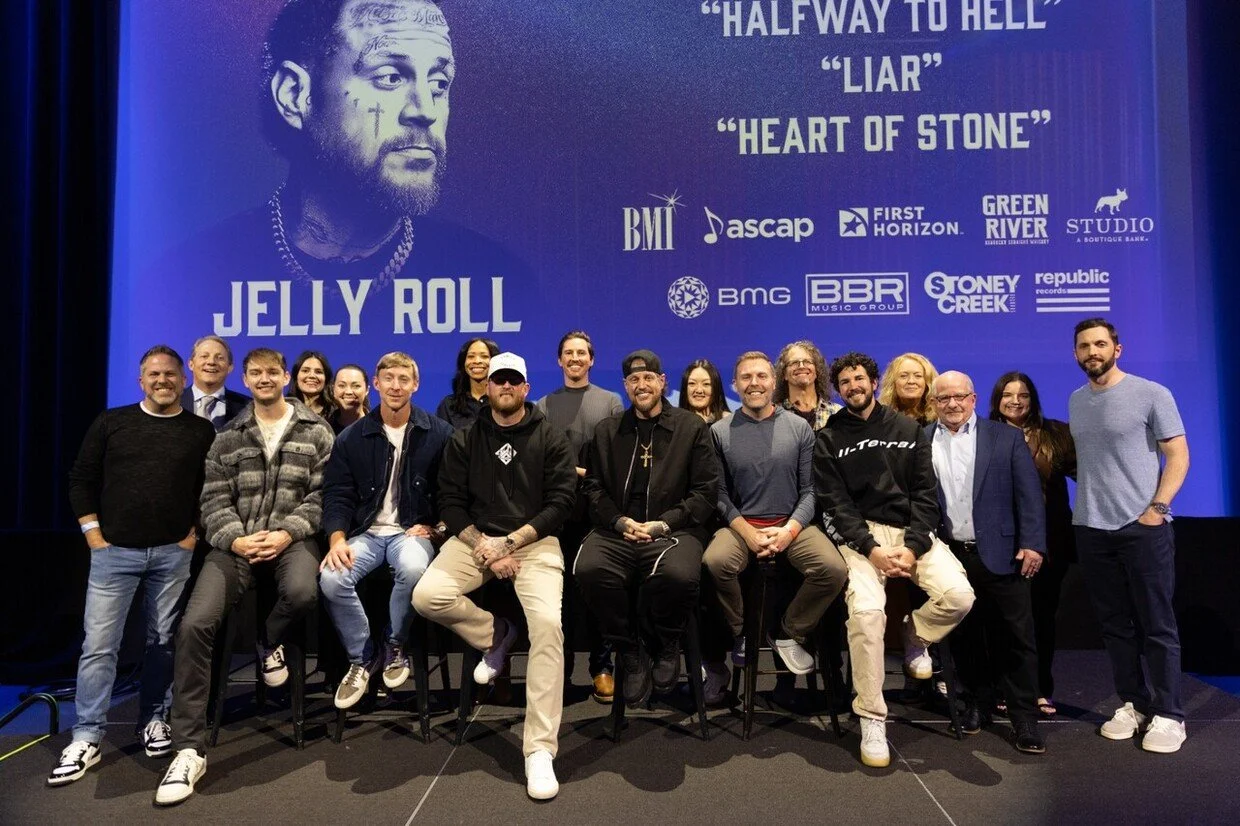 BMI’s multi-GRAMMY® award-winning Nashville native Jelly Roll threw a triple No. One celebration yesterday (3/10) at the Grand Ole Opry’s Studio A, before his member induction. The BBR Music Group/BMG Nashville/Republic recording artist celebrated three of his eight consecutive career toppers as he was reunited with the songwriters, producer and publishers behind “Liar,” “Heart of Stone” and “Halfway to Hell.”