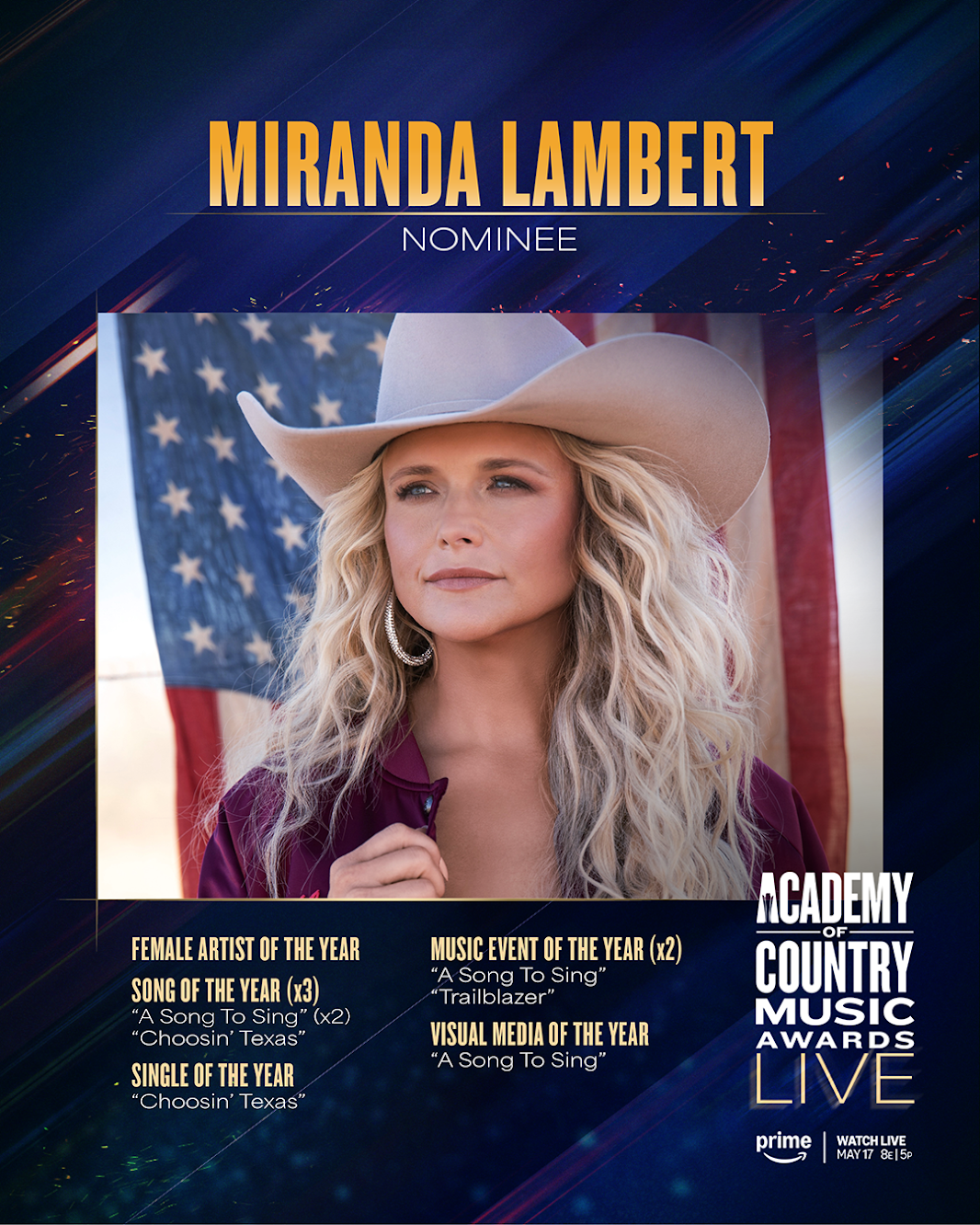 “Honored to wake up and be among the most nominated for the ACM Awards,” Lambert shares. “It’s always special to be recognized and it’s even better when it’s alongside friends and heroes.”