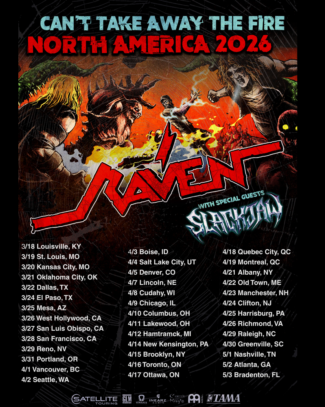 Satellite Touring and GLM Artists are excited to announce RAVEN return to the live stage with an extensive North American tour of 40 shows from March through May this year. Support comes from special guests Slackjaw.