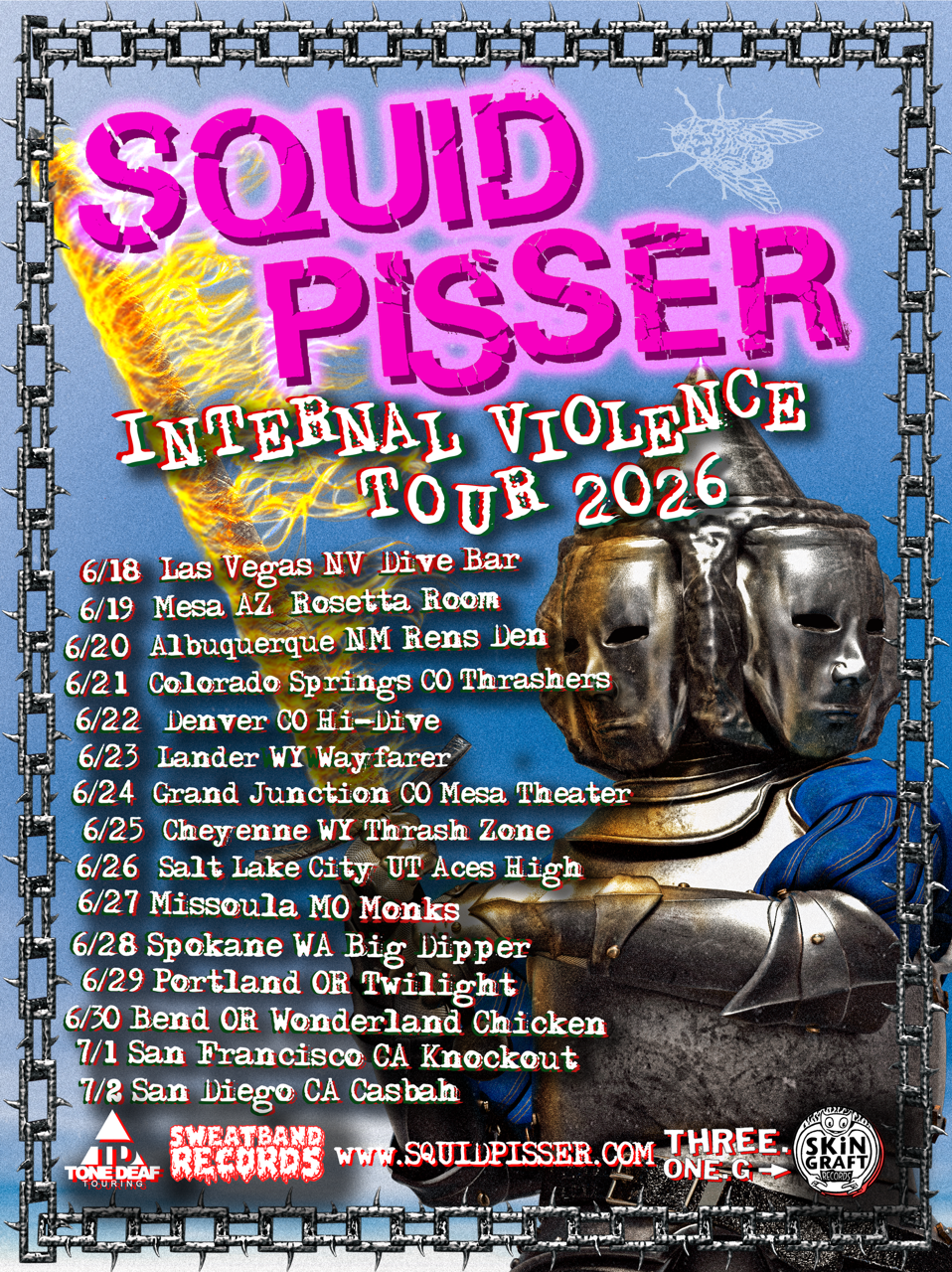 “SQUID PISSER will be scraping whale-tail up and down the West Coast and Southwest on our INTERNAL VIOLENCE TOUR 2026. A quick and filthy two-week June run chock-full of tadpole-batter and cockroach-dumplings.