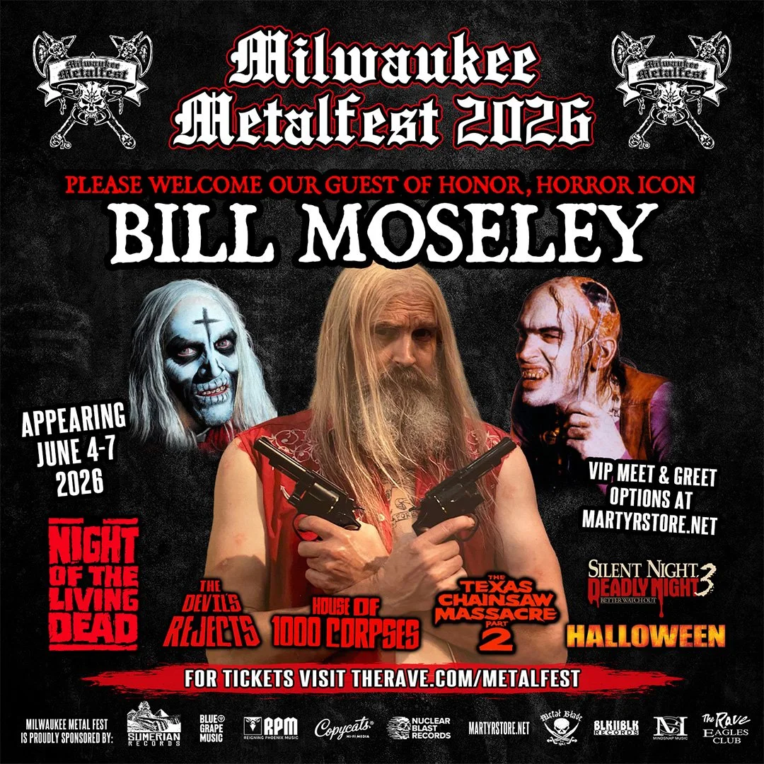Metal and horror have always been a match made in hell. With that, Milwaukee Metal Festival 2026 is pleased to now welcome horror film legend BILL MOSELEY to the festival! Known for his roles in iconic horror movies such as 'Night of the Living Dead,' 'The Devil's Rejects,' 'House of 1000 Corpses,' 'The Texas Chainsaw Massacre' (1986), Rob Zombie's 'Halloween' (2007), and many more, MOSELEY will be available for V.I.P. Meet & Greets all weekend long, including the pre-party. Ticket options to meet the legend himself are available HERE.