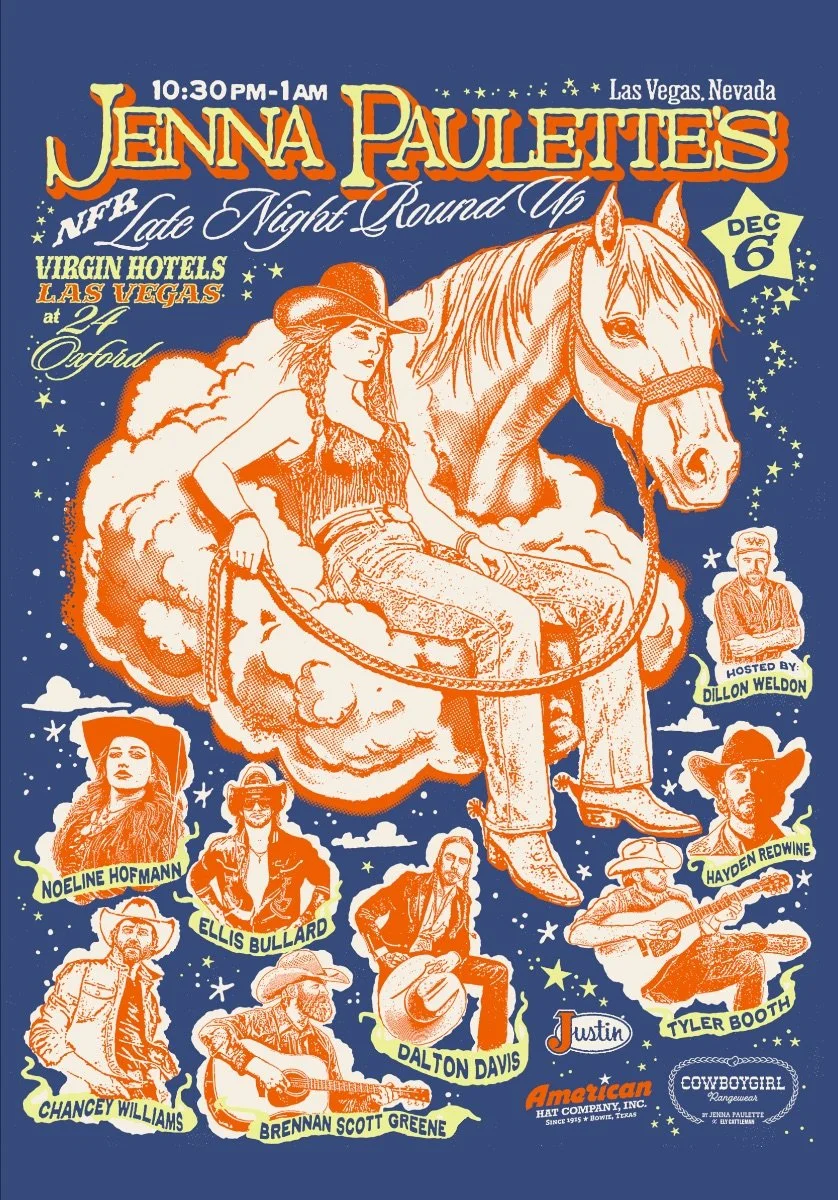 Rising Leo33 country artist and working cowgirl Jenna Paulette is preparing for the 2025 National Finals Rodeo by wrangling together some of her close friends, fellow singer/songwriters Tyler Booth, Ellis Bullard, Dalton Davis, Noeline Hofmann, Hayden Redwine, Brennan Scott Greene and Chancey Williams, for her inaugural NFR Late Night Round Up on December 6 at 24 Oxford in Virgin Hotels Las Vegas. The event, which will take place from 10:30 p.m. to 1:00 a.m., is free to attend and will be hosted by Dillon Weldon, featuring two sets of writer’s rounds, capped with a performance by Paulette.