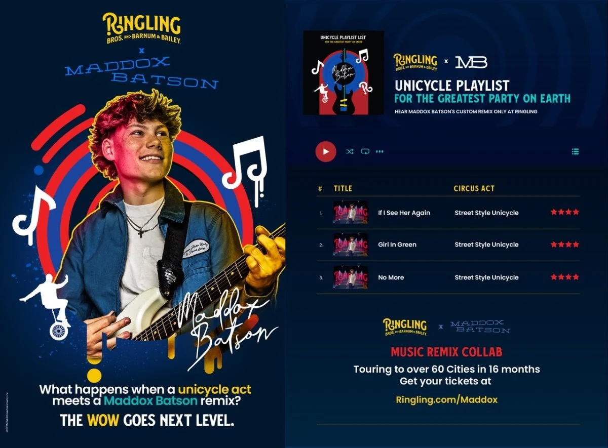 “Music fuels everything in this new era of Ringling, where high-energy sound meets nonstop circus action,” said Juliette Feld Grossman, CEO of Feld Entertainment and Producer of The Greatest Show On Earth®. “When we learned Maddox grew up going to the circus with his family, integrating his music into The Greatest Party On Earth felt like the perfect remix of his country roots reimagined in a bold, modern way for both Ringling fans and Maddox’s audience.”