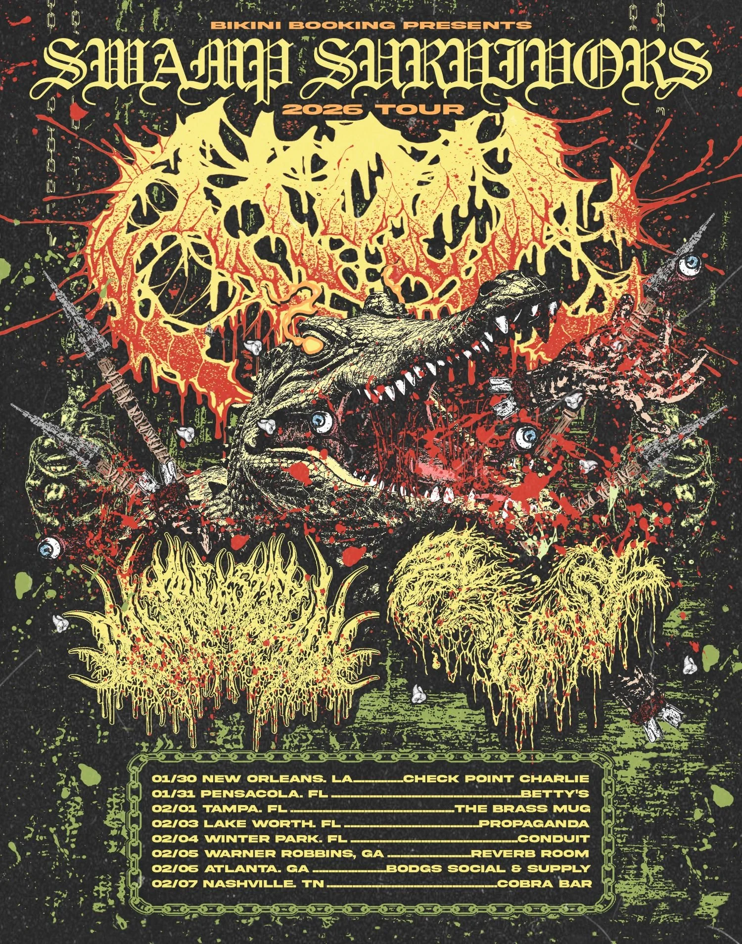 Arizona’s own slamming death metal juggernaut ATOLL are proud to announce the “Swamp Survivors” 2026 Tour, a week-long run of brutal, high-octane shows tearing across the American South beginning January 30, 2026. Supported by a cast of equally savage acts, TRUCKSTOP DICKPILL and SQUELCHING, “Swamp Survivors” promises a visceral, sweat-drenched live experience steeped in ATOLL’s signature blend of groove, slam, and technical ferocity.