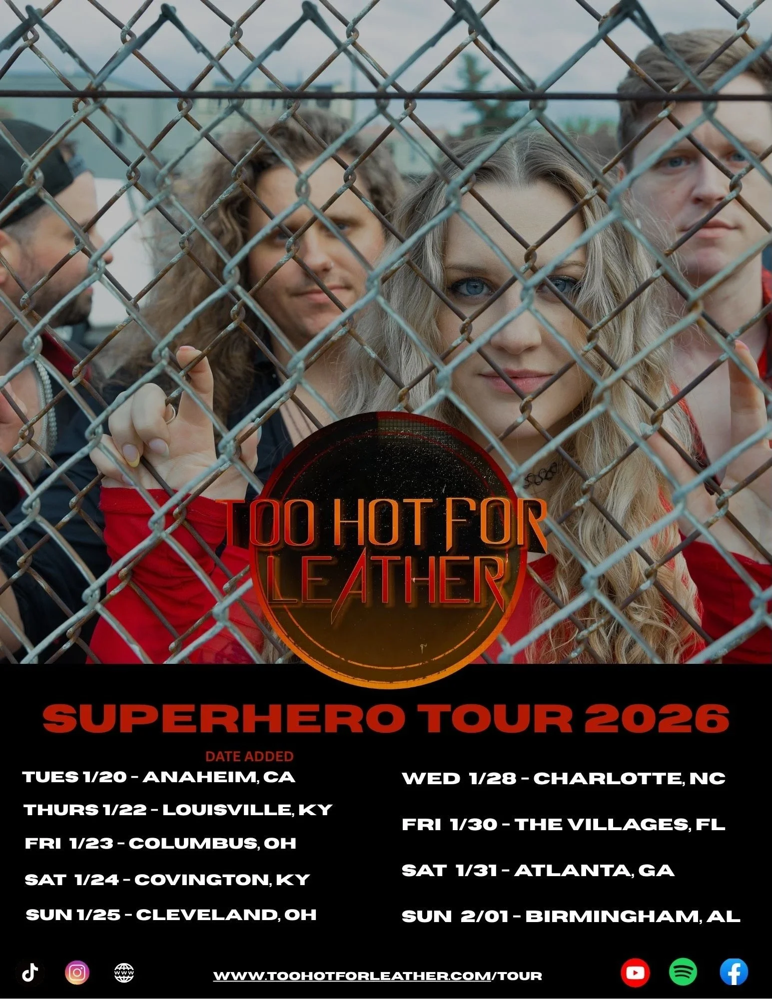 Nashville based TOO HOT FOR LEATHER announce their Superhero Tour 2026, including a performance at NAMM 2026. Drawing from influences like Paramore, Guns N Roses, and Muse, TOO HOT FOR LEATHER has quickly earned a reputation in Nashville's thriving music scene.